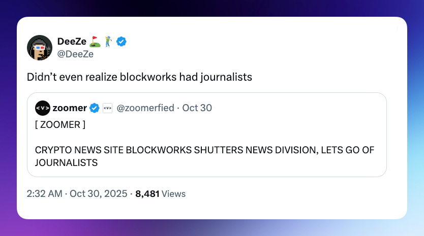 Naturally, crypto, despite occasional projects aspiring to save journalists or the media, isn't spared the same dynamics. Ever since Bullish bought Coindesk, eroding its editorial freedom, crypto media as a whole has been somewhat disappointing. Last week, Blockworks announced that it'd be shutting down its news section to focus on something more profitable (the subtext I read).