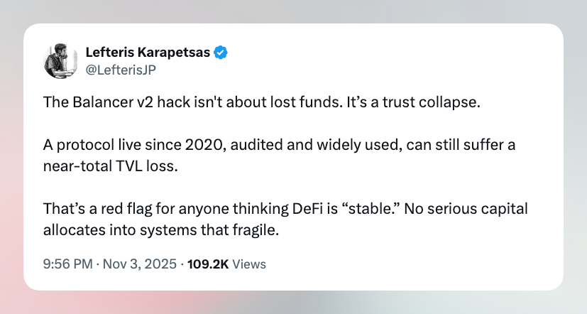 Balancer, one of the longest-standing DeFi projects, has been exploited for roughly $120 million, once again highlighting that safety is just an illusion in DeFi land. For Balancer, it's the third attack this year, following a stablecoin exploit in August caused by a vulnerability in its liquidity pool contracts and a front-end attack that cost users $238,000 in September.