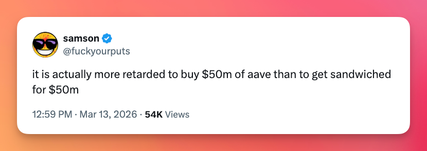 The money didn’t disappear, but it’s now in the hands of a block builder who made $34 million from the trade and an MEV bot that gained $10 million. While Aave has been quick to point at the trader for accepting the 99% slippage, most on CT seem to agree that this is just horrible UX.