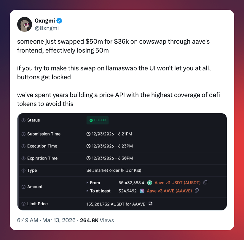Like any proper degenerate, they initiated the trade on their phone, checked the warning boxes that popped up, and hit sign. A few minutes later, they probably regretted their laissez-faire attitude, as it left them with only $37k worth of Aave in return for their $50 million. Or put otherwise, the largest execution loss of its kind.