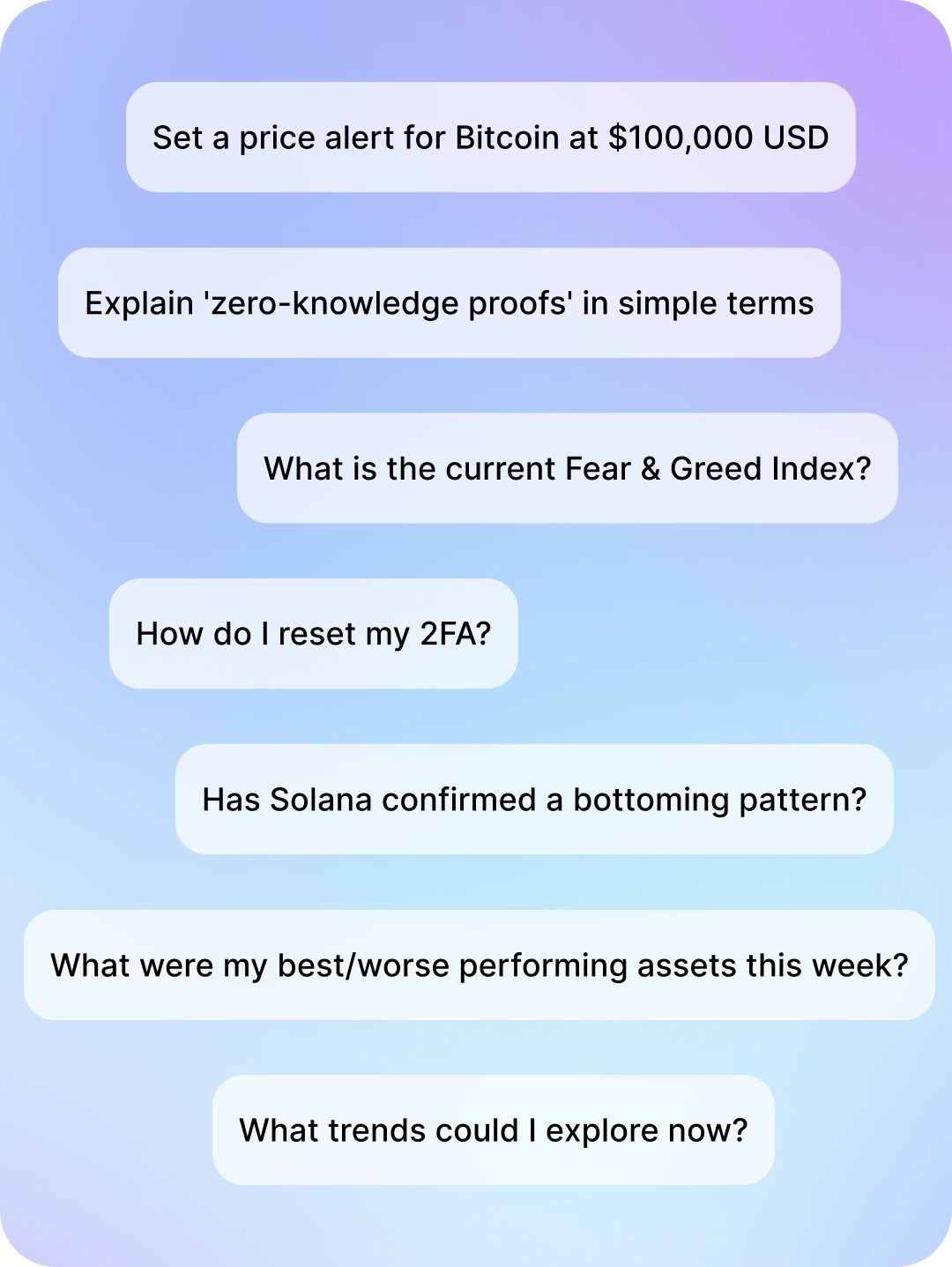 You can ask CoinJar AI about your account, market fundamentals, or complex topics. Here are a few prompts to get started: