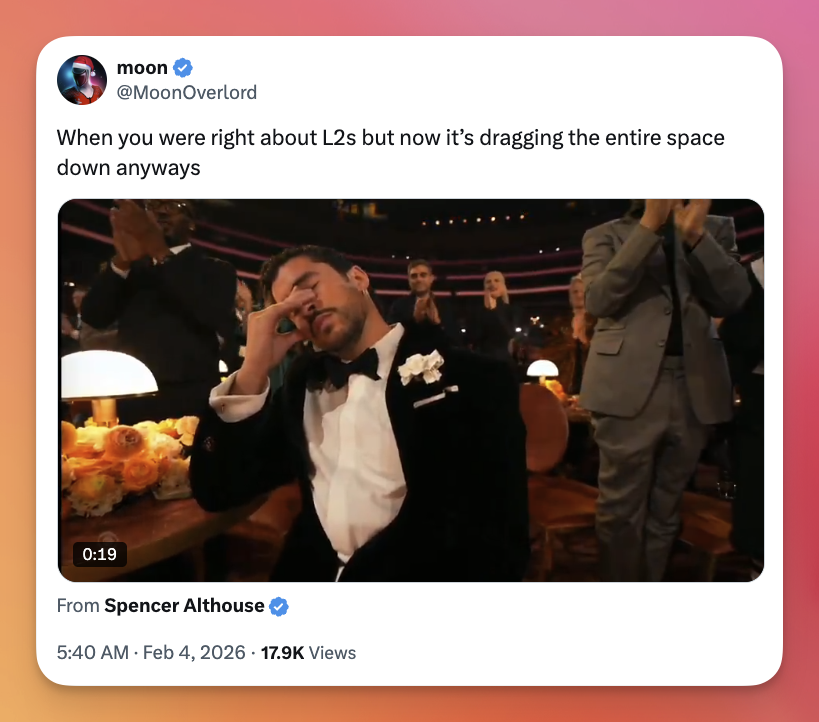 Already when L2s first got started, there was a notion of them being parasitic, or at least useless if one were to take scaling the L1 seriously. It seems we’ve now reached the point where this becomes mainstream knowledge.